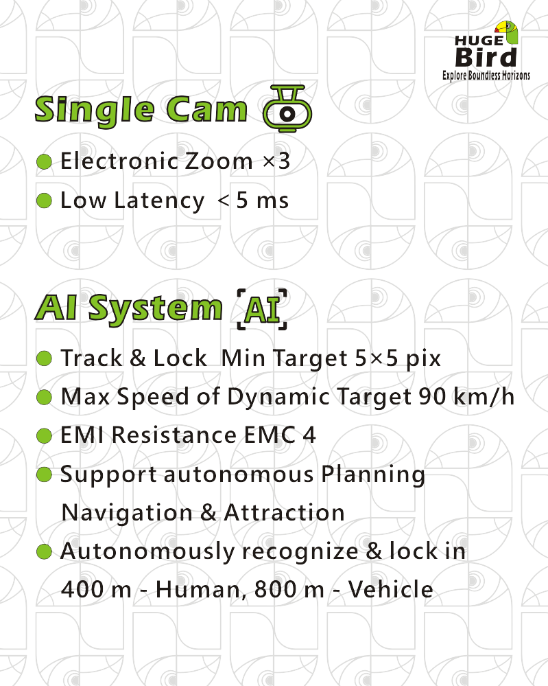 HB-CSA1 is a Single Visible light Imaging System with smart AI embedded, specially designed for drones. Embedded AI Algorithm can autonomously and rapidly recognize, track, lock, attract to the target....